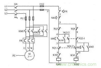 這個電路也很經(jīng)典,其實它是控制電機正反轉(zhuǎn)的加強版。利用行程開關(guān)實現(xiàn)自動往返的效果,按下SB1啟動按鈕KM1自鎖,小車開始正向走,當(dāng)碰到限位開關(guān)SQ1時,KM1線圈失電KM2自鎖,小車又反向運行。只要不按下SB3這個停止按鈕,它就會循環(huán)運行。