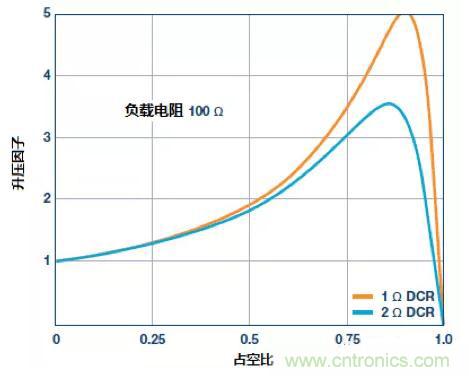 圖2中曲線的變化真實(shí)地顯示出輸出端負(fù)載電阻和電感的直流電阻的改變,對(duì)升壓因子造成的影響。假設(shè)負(fù)載電阻為100Ω,48V的輸出電壓,這對(duì)應(yīng)于負(fù)載電流480mA。當(dāng)電感的串聯(lián)電阻(DCR)只有2Ω,最大升壓因子是有可能剛好超過(guò)3; 但對(duì)于DCR為1Ω,略高于5的升壓因子是可以實(shí)現(xiàn)的。如要求更高的升壓因子,就必須選用具有更低的串聯(lián)電阻值的電感。