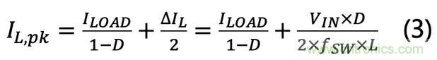 假設(shè)升壓轉(zhuǎn)換器在連續(xù)導(dǎo)通模式 ( Continuous Conduction Mode, CCM) 下工作,峰值電感電流可從公式(1)和(2)得出,具體計(jì)算如下: