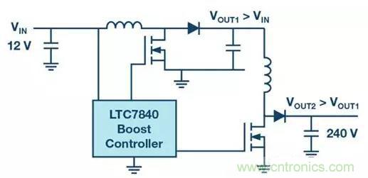 而另一個(gè)獲得較高升壓因子的方案就是使用多相 (Multi Output Phases)。以ADI公司的LTC7840芯片為例,當(dāng)中包含兩個(gè)升壓控制器。這使得實(shí)現(xiàn)兩相升壓概念變得容易。圖三顯示了電源電壓為12V的示例,輸出升壓至240V電壓。兩相升壓級(jí)將電壓分開(kāi)增加,使得每級(jí)僅需要將電壓增加約4.5倍。