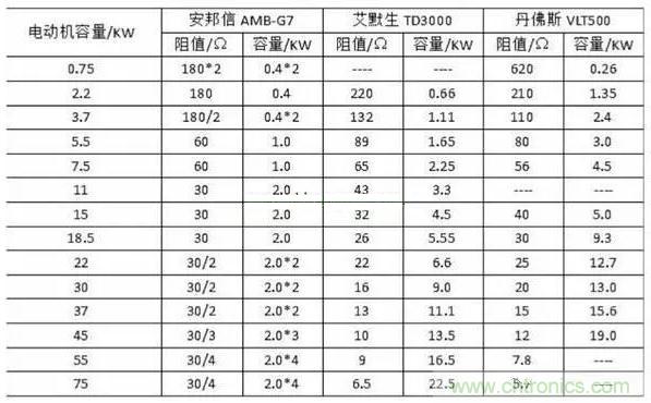 下圖所示為部分變頻器生產(chǎn)廠家提供的制動電阻的阻值與容量。