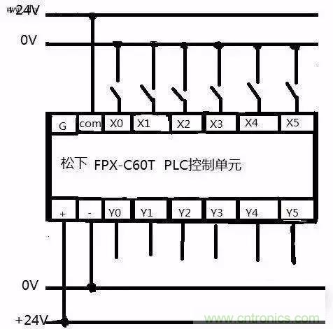 圖中松下PLC為直流匯點(diǎn)式輸入,即所以輸入點(diǎn)共用一個(gè)公共端COM,同時(shí)COM端內(nèi)帶有DC24V電源,在編寫程序時(shí)注意外部設(shè)備使用的是常閉還是常開觸點(diǎn)