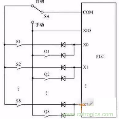 如圖上系統(tǒng)分自動(dòng)和手動(dòng)兩種工作方式,Q1-Q8為手動(dòng)方式用到的 輸入信號(hào),S1-S8為自動(dòng)方式用到的輸入信號(hào)。S1和Q1共用輸入點(diǎn)X0,PLC運(yùn)行時(shí)只會(huì)用到其中一組信號(hào),所以可以共用PLC的輸入點(diǎn)。(圖中二極管是用來防止寄生回路,避免錯(cuò)誤輸入信號(hào)的產(chǎn)生。