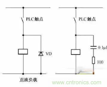 當(dāng)PLC輸入輸出端接有感性負(fù)載元件時(shí),直流輸出的續(xù)流管保護(hù)(直流電路兩端并聯(lián)續(xù)流二極管),交流輸出阻容吸收電路。