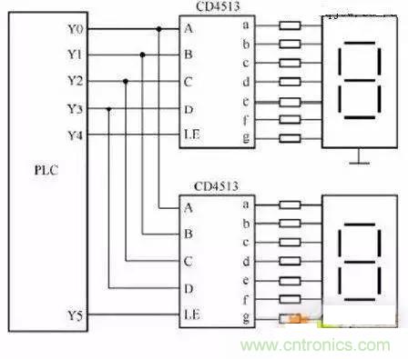 上圖兩只CD4513的數(shù)據(jù)輸入端A-D共用PLC四個(gè)輸出端Y0-Y3,A為最底D為最高,LE 為寄存輸入端,當(dāng)LE 為高電平時(shí),輸入數(shù)據(jù)將存在芯片內(nèi)的寄存器中,并將其譯碼后顯示出來。如PLC使用繼電器輸出模塊時(shí),與CD4513相連的輸出各端在接一個(gè)下拉電阻,避免輸出繼電器斷開的時(shí)候CD4513輸入端懸空。