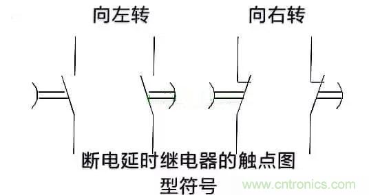 通電延時時間繼電器的觸點看圓弧,圓弧向圓心方向移動,帶動觸點延時動作。再看斷電延時時間繼電器的觸點的圖形符號: