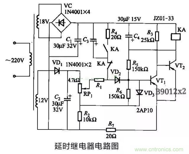 它工作使用一微型變壓器降壓,初級輸入電源為AC交流220Ⅴ,次級有二組電源AC18Ⅴ AC12Ⅴ,AC18V經(jīng)橋式整流二極管(1N4001×4),C1(30uf/32V)濾波后,為kA微型繼電器、復(fù)合三極管ⅤT1 ⅤT2(9012)提供直流DC工作電源。另一組AC交流12Ⅴ電經(jīng)vD1半波整流,C2電解電容濾波,供給調(diào)整充電時間專用可變電位器RP1,C3為一獨石電容,其工作特性較好而用于延時充放電電路中。圖中有JZ01一33繼電器的kA常開和一組kA常閉觸頭,它們在電路中主要作用就是上面給大家說的,通電、斷電延時繼電器在完成預(yù)置時間后恢復(fù)原始狀態(tài),進行下一步工作做好準備。