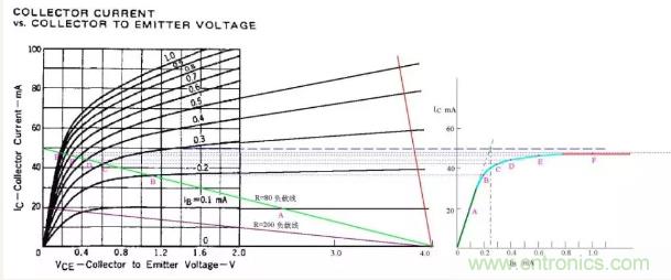 圖中假定電源電壓為4V,綠色的斜線是負載電阻為80歐姆的負載線,V/R=50MA,圖中標(biāo)出了Ib分別等于0.1、0.2、0.3、0.4、0.6、1.0mA的工作點A、B、C、D、E、F。據(jù)此在右側(cè)作出了Ic與Ib的關(guān)系曲線。根據(jù)這個曲線,就比較清楚地看出“飽和”的含義了。曲線的綠色段是線性放大區(qū),Ic隨Ib的增大幾乎成線性地快速上升,可以看出β值約為200。蘭色段開始變彎曲,斜率逐漸變小。紅色段就幾乎變成水平了,這就是“飽和”。實際上,飽和是一個漸變的過程,蘭色段也可以認為是初始進入飽和的區(qū)段。在實際工作中,常用Ib*β=V/R作為判斷臨界飽和的條件。在圖中就是假想綠色段繼續(xù)向上延伸,與Ic=50MA的水平線相交,交點對應(yīng)的Ib值就是臨界飽和的Ib值。圖中可見該值約為0.25mA。