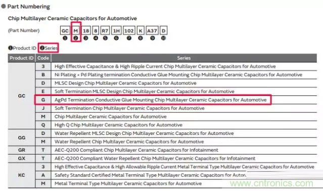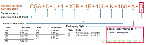 對(duì)于TDK的汽車級(jí)CGA系列的電容來(lái)說(shuō),環(huán)氧樹脂安裝的電容只在后綴上以一個(gè)字母"D"表示,這一般定義為“TDK內(nèi)部代碼”,并可以有其他字母如“A”、“B”、“C”、“E”等。