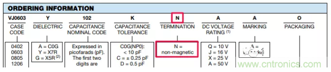 對(duì)于Vishay(威世)的VJ系列的電容器,有兩種不同的零件編號(hào)方案需要注意——老的和停產(chǎn)的零件編號(hào)方案將環(huán)氧樹脂安裝選項(xiàng)指定為“N”選項(xiàng)。