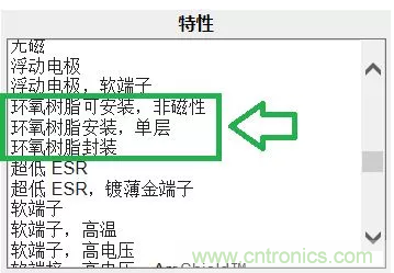 此外,有兩種選擇這些環(huán)氧樹脂安裝電容,或者過(guò)濾掉它們。若只選擇環(huán)氧樹脂安裝選項(xiàng),請(qǐng)?jiān)?quot;特性"選項(xiàng)中選擇環(huán)氧樹脂,如下圖所示: