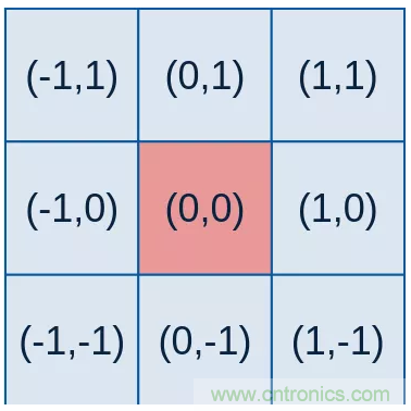 其中(x,y)(x,y)為點坐標,在圖像處理中可認為是整數;σσ是標準差。要想得到一個高斯濾波器的模板,可以對高斯函數進行離散化,得到的高斯函數值作為模板的系數。例如:要產生一個3×33×3的高斯濾波器模板,以模板的中心位置為坐標原點進行取樣。模板在各個位置的坐標,如下所示(x軸水平向右,y軸豎直向下)