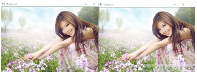 下圖是自己實現的高斯濾波器和OpenCV中的GaussianBlur的結果對比