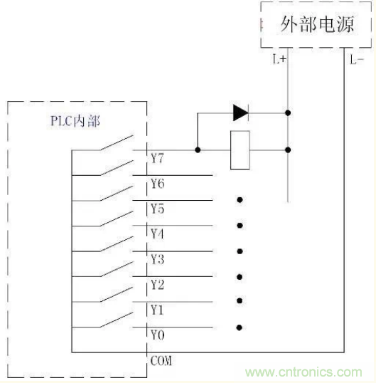 和繼電器輸出形式電路一樣,在驅(qū)動(dòng)感性負(fù)載時(shí)也要在負(fù)載兩端反向并聯(lián)二極管(二極管的陰極接電源的正極)防止過(guò)電壓,保護(hù)PLC的輸出電路。