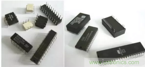 (b)元器件封裝 圖F1-19 常用的接插件 (8) 雙列直插式集成電路芯片。用戶在電路設計過程中,為了方便安裝和調試,在初次設計電路板時往往將許多集成電路芯片的選型定為雙列直插元器件(DIP)。圖F1-20所示為常用的雙列直插式集成電路芯片。