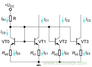 與典型的靜態(tài)工作點穩(wěn)定電路一樣,Re0和Re1是電流負(fù)反饋電阻,因此與鏡像恒流源電路相比,比例恒流源的輸出電流IC1具有更高的穩(wěn)定性。