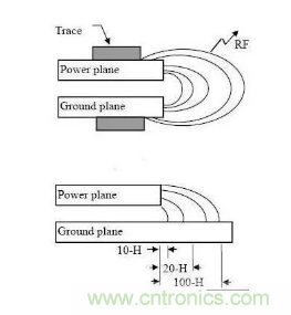 這個(gè)規(guī)則經(jīng)常被要求用來作為降低來自0V/電源平面結(jié)構(gòu)的側(cè)邊射擊發(fā)射技術(shù)(抑制邊緣輻射效應(yīng))。但是,20H規(guī)則僅在某些特定的條件下才會(huì)提供明顯的效果。