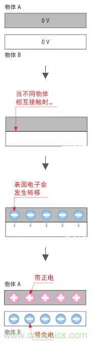 當(dāng)兩個不同物體相互接觸時,表面電子就會發(fā)生轉(zhuǎn)移。獲得電子的一端帶負電,失去電子的一端帶正電。