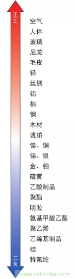 在該“帶電序列”中,正方向上的物體帶正電而負方向上的物體帶負電。此外,隨著物體在序列中距離的增加,相互之間摩擦?xí)r產(chǎn)生的靜電量也會越大。