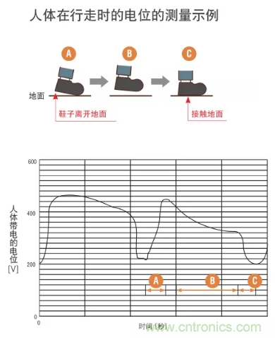 人體中有 80% 以上是水,因此靜電很容易流過人體。穿著鞋時,鞋底充當(dāng)了絕緣體,防止靜電流動。這樣所產(chǎn)生的靜電就會聚集起來,無法釋放。下圖表明了人在行走時產(chǎn)生的靜電量。