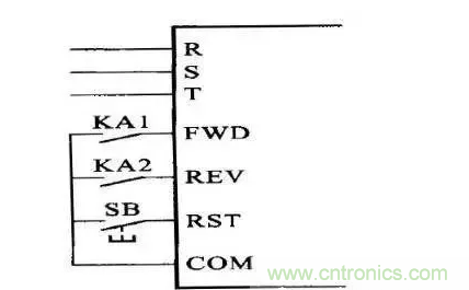 3、找到變頻器的控制端子,在外面加裝2個中間繼電器,分別是KA1與KA2,接線方法如下圖所示,KA1工作時,變頻器正轉(zhuǎn),KA2工作時,變頻器反轉(zhuǎn),SB是復(fù)位按鈕,當(dāng)有異常報警時,變頻器會停機,此時按下RST,可以消除報警,然后再重新啟動變頻器。
