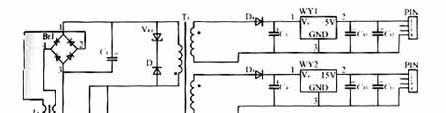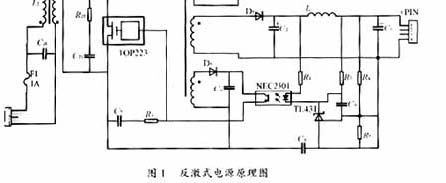 輸入為交流85~200V,經(jīng)功率二極管整流橋變?yōu)橹绷?,作為DC/DC反激變換器的輸入,輸出為三組直流:5V、15V、20V,另外還有一輔助電源5V,用來給光耦NEC2501供電??刂齐娐窞榉答伩刂疲_關(guān)選用TOPSwitch電源芯片(TOP223)。TOPSwitch為三端離線式PWM電源集成控制器,它將PWM控制器與功率開關(guān)MOSFET合為一體,采用TO-220或8腳DIP封裝,除D、C2腳外,其余6腳連在一起作為S端。