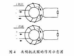 對(duì)開關(guān)電源二根進(jìn)線而言,存在共模干擾(二根線上受干擾信號(hào)相對(duì)參考點(diǎn)大小、方向相同)和差模干擾(二根線上受干擾信號(hào)相對(duì)參考點(diǎn)大小相等、方向相反)。共模扼流圈如圖4所示。