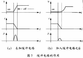 未加緩沖電路和加入緩沖電路之后開關(guān)管電壓Ut和電流i及功耗Pt的波形如圖7所示。由圖7可知,加RC緩沖電路后,開關(guān)電壓上升速率減慢,變小,噪聲減弱,抑制了EMI。另外,開關(guān)功耗變小,使管子不致因過流過熱而損壞。緩沖電路中的R21是在開關(guān)開通,電容C21放電時(shí)起到限流作用,避免對(duì)管子的沖擊。