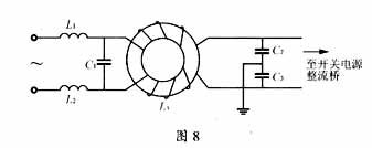 為更好抑制EMI對(duì)電路的一些改進(jìn)本電路中主要的EMI是電源噪聲對(duì)電網(wǎng)的干擾。可將原來的共模扼流圈L2與電容C10、C1組成的濾波電路,改善為如圖8所示電路,則L1、L2、C1可除去差模干擾,L3、C2、C3可除去共模干擾。L1、L2的磁芯為不易飽和的材質(zhì)。C1可選陶瓷電容,耐壓必須考慮輸入電壓的最大可能值,通常選用0.22~0.47μF。L3是共模扼流圈。選定C=C2=C3,截止頻率f0,則可根據(jù)計(jì)算L3;選定C1,截止頻率f0,可計(jì)算出L1、L2。