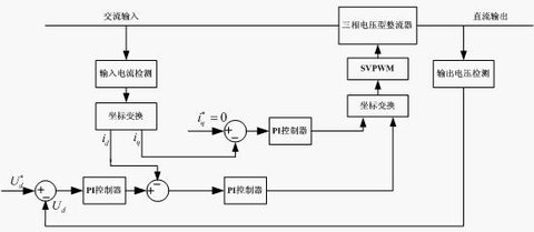 圖1為三相電壓型PWM整流器空間矢量控制框圖,它由主電路和控制回路兩部分組成。其中,控制回路主要由輸入電流和輸出電壓檢測、坐標變換、PI控制器和SVPWM脈沖產(chǎn)生等部分組成。其原理如下:三相交流電通過三相電壓型整流電路整流為穩(wěn)定的直流電壓。同時,控制回路對主電路的輸入電流和輸出直流電壓進行檢測,一方面,將檢測值與給定值進行比較后送入PI控制調(diào)節(jié)器,輸出值與電流比較并將其輸出送入PI控制器變?yōu)殡妷盒盘?,再?jīng)坐標變換送入SVPWM脈沖產(chǎn)生單元,完成電壓閉環(huán)控制;另一方面,將檢測的輸入電流經(jīng)坐標變換與給定電流比較,送入PI控制器變?yōu)殡妷盒盘?,再?jīng)坐標變換送入SVPWM脈沖產(chǎn)生單元,完成電流的閉環(huán)控制。矢量控制單元通過矢量運算,生成所需要的PWM波,控制雙向變換器,達到輸出電壓的穩(wěn)定和輸入側(cè)交流電流的正弦化。