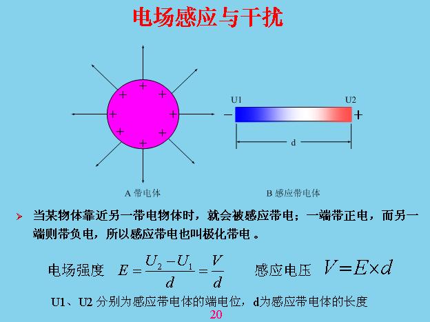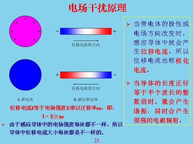 電磁干擾的原理是帶電體電磨和位能不斷的改變,會對感應(yīng)體產(chǎn)生位移電流,當這邊是正的時候,電流的方向往這邊流,當是負的時候電流往另外一邊流。位移電流和一般電工學(xué)里面的位移電流不一樣,位移電流不需要回路,在任何一個導(dǎo)體里面都會產(chǎn)生位移電流,并且位移電流的大小在這個導(dǎo)體里面的每個地方都不一樣,不管這個怎么變化,中間位移電流等于零,只在兩端位移電流是最的大,中間那個地方等于零。如果你不好理解,你把這個當成一根天線就理解了,天線發(fā)射電磁波的時候也是沒有回路的,就是靠不斷的對它進行充放電,這個原理是一樣的。還有一種情況,當兩個變換的速度和來回移動的方向、距離正好是半個波長的時候它會產(chǎn)生諧振,這個在天線理論里面可以學(xué)到。因為位移電流是有速度的,不能說速度等于無窮大,我這邊變你也變,如果移動有速度就會產(chǎn)生疊加和抵消的作用,就會產(chǎn)生諧振。