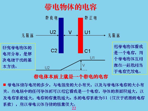 我們給大家介紹一個很重要的概念,就是電容。這個電容和我們現(xiàn)在電路里面用的電容是兩個概念,大家不要混淆。任何帶電體我們都可以把它看成一個電容,電容的大小跟它帶的電壓和電荷的多少有關(guān),如果帶的電荷越多,電壓越高它的電流就越大。電容的概念其實與電荷的概念也是互相對應(yīng)的,我們把這個電容器看成是兩個電容進行串聯(lián),也就是說帶電體帶正電,帶正電是對于無限遠的地方來說的,為什么呢?因為這個帶電以后電場分布是發(fā)散性的,中間這一點是最強,離的越遠的時候電感強度就越來越低,當無限遠的時候就等于零,你不能拿它來參考地球,參考地球的話相當于范圍太小,本身地球也可以看成電容,所以分析電容的時候最好用無限遠的地方作為參考點。也就是說我們計算電容的時候以無限遠的地方考慮,計算電容也是以無限遠的地方考慮。把這兩個電容靠在一起的時候就變成了電容器,你就可以利用這兩個電容的電位梯度和電容器來分析。任何一個帶電體都可以看成一個電容,一個孤立球?qū)w的電容等于表面積除以半徑,再乘以電容系數(shù)。地球的容量算出來就是7×10-4(F),把兩個孤立電容進行推導(dǎo),算出來就是這樣,電容器正好等于上面儲存的電容量除以電位差。明白電容的概念以后,也要分析電路的電磁感應(yīng)方面,要有量的概念。有了量的概念我們可以對電磁干擾進行分析,比如說這邊是一個干擾電壓,通過這條電路進行供電,旁邊也有一個電路,這個電路就會受到干擾,干擾怎么計算?它的導(dǎo)向電路是什么?我們可以把兩個導(dǎo)線看成一個電容器,就是有一個耦合電容。等效電路相當于這邊,你要減少兩個回路互相干擾的程度就必須要減少上面的Cm電容,把兩條線隔得越遠越好,而且越短越好,只要面積越小電容器越小,離得越遠電容器也越小。