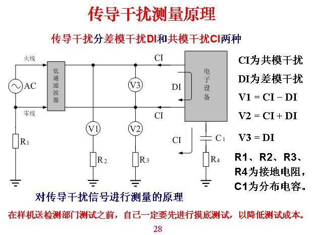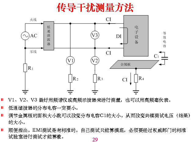 傳導(dǎo)干擾測量原理。這里面?zhèn)鲗?dǎo)干擾有兩個干擾,一個是共模,一個是差模,這樣一個回路是流進入又流出來的,這叫做差模。這兩個同時進去從另外一邊流出來叫共模,共模干擾很簡單,就是以大地為一端,另外一端是以上面的線路、設(shè)備,不管什么線為一端測到的電壓,這叫做共模干擾。因為測量的時候必須要與一根電路連接,先測三個電壓,這是測這個與大地之間的電壓,這是測兩條線之間的電壓,然后得出結(jié)算公式。V1=CI-DI,就是共模干擾減去差模干擾。V2=CI+DI,V3=DI,R1、R2、R3、R4為接地電阻,C1為分布電容,如果到檢測所去測之前自己一定要先進行摸底測試,用一塊墊板或金屬板放在下面接地,等于說分布是固定的,利用標準一塊板與機器造成分布電容,一般是一個平方米等等,是由他們定的,你可以做試驗,測多大都沒有關(guān)系,但它是固定的,測電視機是什么樣,測手機是什么樣,這是不一樣的。傳導(dǎo)干擾測量方法。分布電容在這一塊金屬板,與它之間產(chǎn)生分布電容,當然用這個板帶分布電容,測出來的結(jié)果數(shù)字越大,這只是用來做對比,以此為基礎(chǔ)。我們做摸底可以用大一點測,容易測得到,但你測得不算數(shù)。