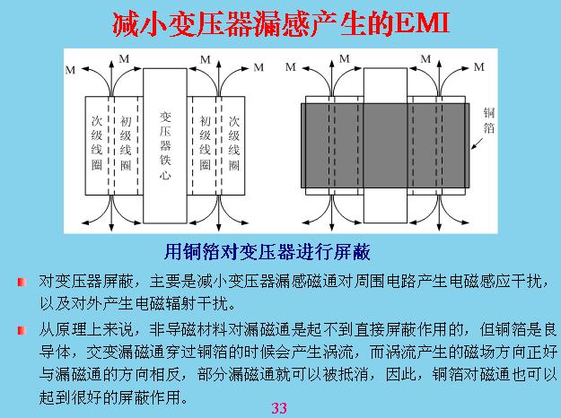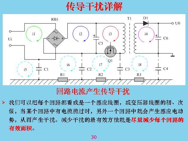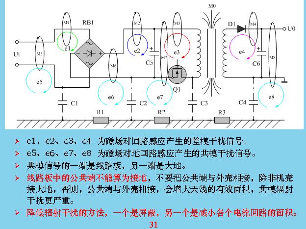 這個更加具體,有電力穿過的時候會產(chǎn)生電力線,電力線會產(chǎn)生共模干擾,這幾個都是共模干擾,那些都是差模干擾。這些干擾主要是如何產(chǎn)生的?本身線路里面只有電流流過,構(gòu)成一個線圈或?qū)Ь€都會產(chǎn)生干擾,最大的是變壓器漏感,這是其他回路的好幾十倍。所以變壓器漏感最好進行屏蔽?怎么屏蔽呢?在線圈的外邊用一層金屬,鋁片也好,銅片也好,一般用銅片包起來,包起來應(yīng)該讓它短路,就是用焊絲焊起來,漏感在上面也會產(chǎn)生渦流,一產(chǎn)生渦流就會產(chǎn)生抵消干擾的磁場,就相當于把漏感抵消掉。