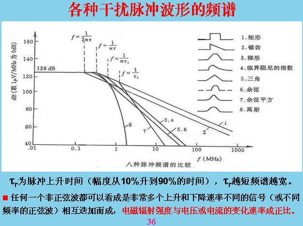 各種干擾脈沖波形的頻譜。輻射和干擾的頻率有關(guān),頻率一般都是指正弦波,這樣比較好理解,對于方波或正弦波的波形,一般我們都可以把它看成是無窮多個上升率不同的波形進行疊加,也就是用基數(shù)展開,這是數(shù)學(xué)表達方式,比較正確是用不同的上升率,不同的波形進行疊加,但上升率不好理解,一般都是用正旋波表示。這里面波種不同的波形,它產(chǎn)生的干擾不一樣。這種的頻譜是最寬的,這種是高新的,接近于正弦波。120dB的時候是1v,126dB就是2v,大家知道dB是什么嗎?它一般用來表示放大倍數(shù),就是輸出電壓與輸入電壓之比,取數(shù)值大于20。為什么用這個倍數(shù)來比?用倍數(shù)比相當于把視角范圍縮小,讓你好看,如果從線性來看,一個毫伏一直到兩伏就沖到天上去了,不好看。用對數(shù)坐標表示,越往下越壓縮,前面是壓縮比較小,這邊也是。這里變成10,變成了100,變成1000,這是在電工里面用量表示,用倍數(shù)表示,每6dB就差1倍,大家記住。這里是60÷20=3,是3個據(jù)波,這里是1000微伏,120是正極,1V+6dB=2v。到測試所去測試給一個曲線,很多人問我dB是什么意思?dB就是一個坐標,后面會加一個單位,一個毫伏0dB就是一個毫伏。功率不是20倍表示了,而是用10倍表示,每3dB差一倍功率,電壓就是每6個dB差一倍。