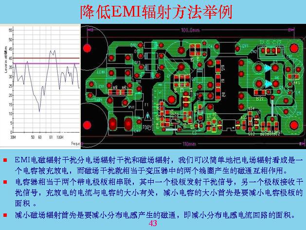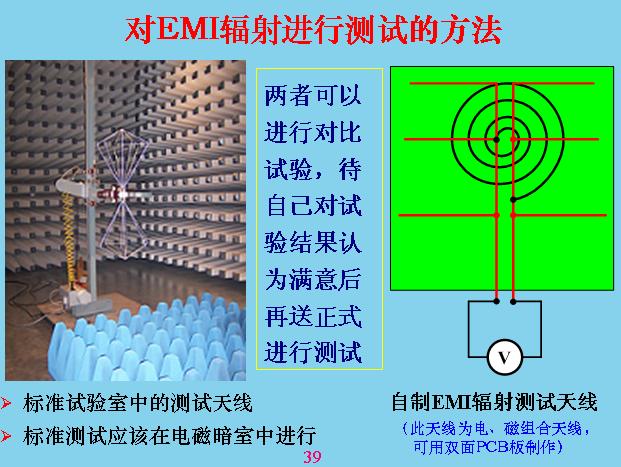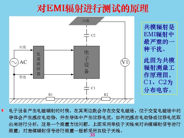 另外對于輻射干擾,我們最注意的就是共模干擾,差模干擾相對來說比共模干擾小很多,我們做過一個試驗,在同一個導(dǎo)線里面流過的電容,相差的共模干擾是2500倍。上面就是對輻射進行測試,剛才是共模干擾,其他都是傳導(dǎo)測試,其實就是輻射干擾測試,一般就是用天線來測,天線的測試原理就是這樣的,量天線和大地之間的電壓,這個設(shè)備與大地之間有分布電容,前面已經(jīng)說過了,放這個在上面,與板接地產(chǎn)生分布電容。天線也有分布電容,分布電容不是跟設(shè)備大小和距離有關(guān),所以測試的時候都有一個標準,固定設(shè)備中間距離有多遠,天線面積用多大,還有一套天線,很多天線,不只是一個,計最大的那個,就是測試電壓最大的那個,天線對輻射會產(chǎn)生諧振。