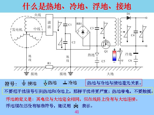 我們后面再講很具體的電路問題。很多人對地的概念不是很清楚,也不了解,現(xiàn)在很多人都把電路里面的公共關(guān)說成地,具體是不是?我們先介紹幾個概念。一般按照道理,最早地就是大地,后來地慢慢習慣用到設(shè)備里面,包括外殼、輸入線,比如說示波器或者信號線,與大地連在一起,有的不連,現(xiàn)在就變成了一個很模糊的概念,我們就把熱地、冷地、浮地、接地幾個概念簡單介紹一下。這個符號是比較標準的接地符號,就是接大地的,不管哪個設(shè)備接地都是這個符號。熱地國家還沒有標準,大部分都習慣用這個箭頭作為熱地。冷地國家也沒有標準,大家都接受是這樣的,這三個地基本上電工里面都有明確定義的,這個地就是接大地,熱地就是里面整流出來電源的某一端是公共端,人去摸它會帶電,會電死人,和前面的火線會產(chǎn)生回路電流,會電到人,所以這個叫做熱地。還有一個通過電子耦合以后沒有電的關(guān)聯(lián),只有磁場關(guān)聯(lián),你去量根本沒有回路,叫做冷地,手是可以摸的。但是你不要以為它是冷地就不帶電,實際上它還是帶電,為什么帶電?大家可能一下子不是很清楚,它帶的是靜電,相當于極化帶電,就是線圈通過感應(yīng)以后,一頭帶負的,一頭帶正的。電容機也是,有一頭帶電,有一頭不帶電,這一點還是帶負電,不帶電的沒有跟電路連接,定位與大地一樣,所以叫做浮地。對應(yīng)的不是與大地相等,但沒有與大地連接,拿電表來量這一點與大地沒有電壓。浮地的信號現(xiàn)在還沒有,如果大家參考的話可以參加這個符號來用,這個地方電位等于零,當兩邊發(fā)生變化就用這個來表,對電路分析有好處,特別是嚴重干擾的時候一定要把浮地找到,因為電位越高的地方電容越容易干擾,電位等于零,也就是浮地和電位是越低的地方干擾就越小。