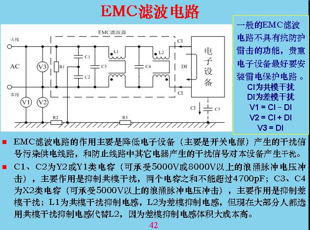 為了降低傳導(dǎo)干擾,現(xiàn)在一般在輸入電路里面都要加濾波器,這邊是設(shè)備產(chǎn)生的干擾,通過這幾個濾波以后就會把幾個電壓降低,這兩個電容是共模的濾波電容,這幾個有共模電感,也有差模電感,因為共模電感的體積比較大,成本比較高,所以大家都沒有用,都在用共模電感代替。因為共模電感本身有漏感,漏感對差模來說也有抑制作用,所以相對來說用共模電感代替差模電感,成本可以大大降低。這兩個電容很關(guān)鍵,在安全里面兩個的和不能超過470b,為什么?安全測試的時候在安全設(shè)備上加2500v交流電來測與地的漏電,如果超過2.5毫安就算不合格。這樣算的話50就是2500v電壓,算出來的電壓不能超過470b。按照共模預(yù)計,這兩個做得更大一點,最大不能超過4700v。這是差模電容,差模電容沒有要求,用的越大越好。但是用得越大也有一個問題,把電容線拔掉的時候上面帶電不能超過,所以這里必須加一個放電電阻,這邊大的以后也可以加一個放電電阻,充電拔掉以后,下面人不能摸,會電到人,所以用放電電阻把它放掉。