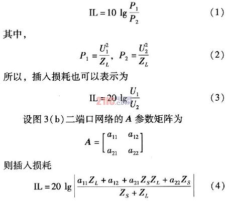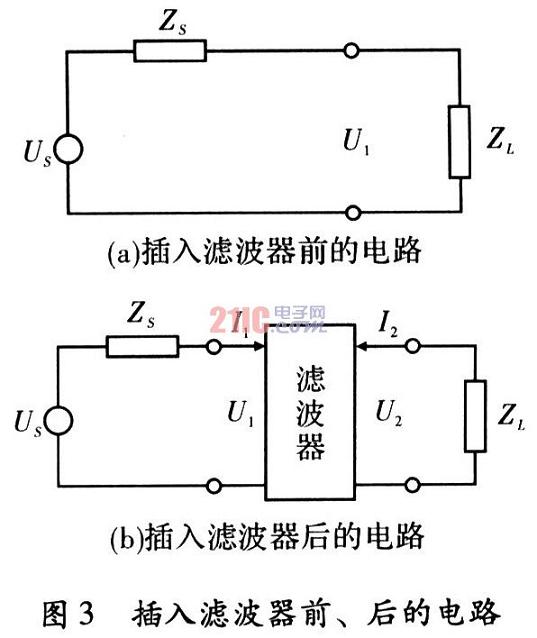 插入損耗是評價濾波器性能的主要指標,它是頻率的函數(shù)。插入損耗的定義為,沒有濾波器接入時,從噪聲源傳輸?shù)截撦d的功率P1和接入濾波器后噪聲源傳輸?shù)截撦d的功率P2之比,用dB表示。插入損耗越大,說明濾波器抑制干擾的能力越強。濾波器接入前后的電路圖,如圖3(a)和圖3(b)所示。濾波器的插入損耗由式(1)表示。