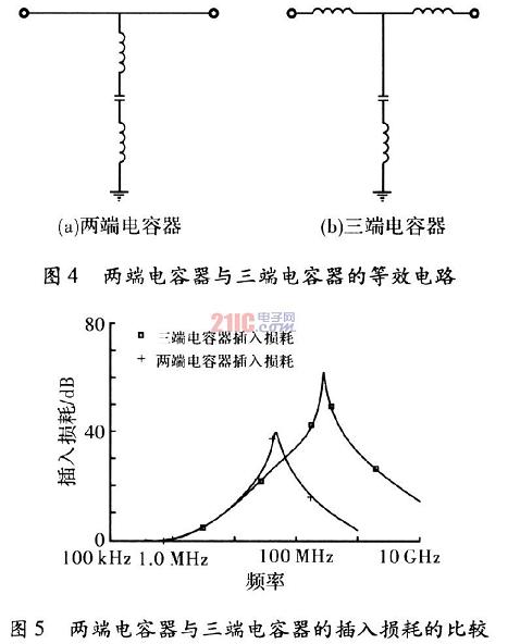 在高頻線路中,因為一般電容器的引線具有電感分量,所以影響了其高頻特性。而三端電容器在結(jié)構(gòu)上可以做到與電容器串聯(lián)的剩余電感分量很小,因此其插入損耗特性優(yōu)于兩端電容器,從而改善了電容器的高頻特性。三端電容器有引線式和片狀式兩種。