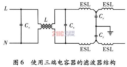 線路旁通電容Cy是用來消除高頻噪聲的組件,基于對今后開關(guān)操作頻率的高頻化考慮,宜選用能消除頻率高達1000MHz噪聲的電容器。而一般的兩端結(jié)構(gòu)的旁通電容器僅能消除30MHz左右的噪聲。由以上介紹可知,相對兩端電容器來說,三端電容器能更好地抑制高頻噪聲。以EMI濾波器的一般結(jié)構(gòu)為基礎(chǔ),用三端電容器替代其中的兩端旁通電容Cy,電路圖,如圖6所示。其中ESL為三端電容器信號線上的等效串聯(lián)電感。