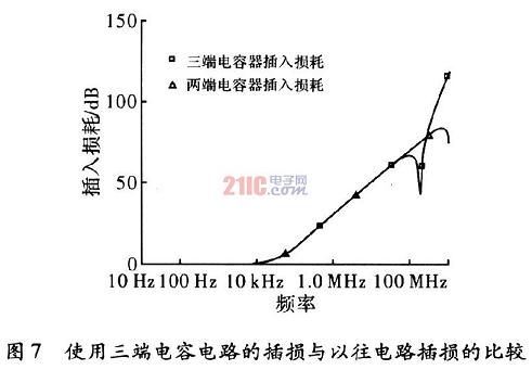 取差模電容Cx為0.1μF,共模電容Cy為2200pF,共模電感L取8mH。三端電容的等效串聯(lián)電感ESL取0.36nH。在50 Ω/50 ΩQ系統(tǒng)中分別對一般結(jié)構(gòu)的EMI濾波器和使用了三端電容器的EMI濾波器的插入損耗進行PSpice仿真。如圖7所示,EMI濾波器在使用三端電容時,諧振點之后的插損效果明顯好于在濾波器中使用兩端電容的插損。提高了濾波器在高頻段的性能。
