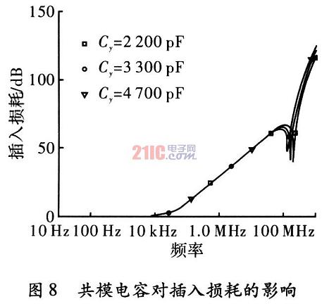 在使用三端電容的濾波器電路中,輸入阻抗和輸出阻抗都取50時,分別取共模電容Cy為4700pF,3300pF和2200pF,其他參數(shù)不變,觀察共模電容Cy變化時對插入損耗的影響。通過圖8的仿真結(jié)果看出,隨著共模電容的增大,在高頻段插入損耗有所提高,并且濾波器諧振點降低;而在低頻段基本沒有變化。因此可以通過選擇較大的共模電容來提高濾波器高頻段的插入損耗。由于共模電容需要接地,有漏電流,Iid的存在,對人身安全存在威脅。而共模電容越大,漏電流越大,所以選擇共模電容時需要在漏電流滿足安全條件的情況下取值。