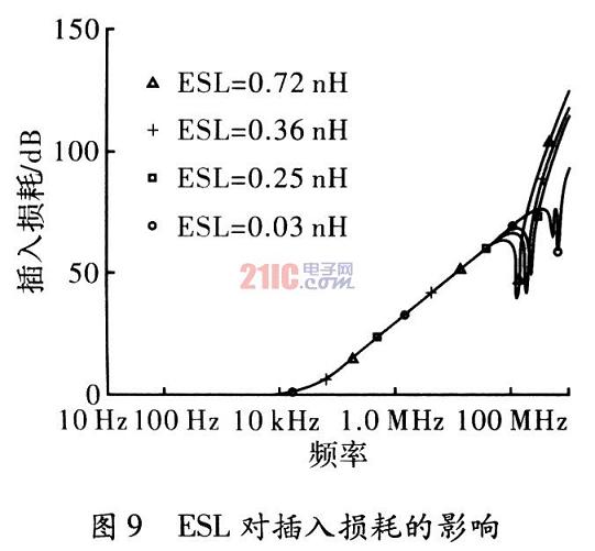 考察三端電容器與信號線串聯(lián)的等效串聯(lián)電感ESL對插入損耗的影響。取共模電容Cy為3 300 pF,取ESL分別為0.03 nH,0.36 nH和0.72 nH,其他參數(shù)值不變。從圖9的仿真結(jié)果可以看出,隨著ESL降低,諧振點提高,諧振點之后的插入損耗下降。