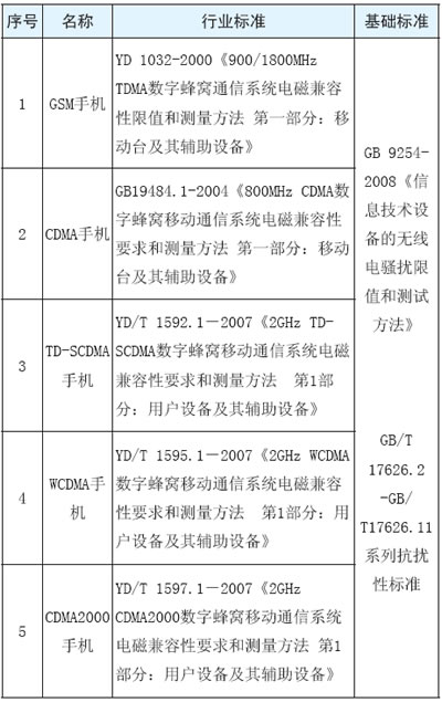 不同制式的手機(jī)電磁兼容測(cè)試時(shí),選擇不同的行業(yè)標(biāo)準(zhǔn),依據(jù)的基礎(chǔ)標(biāo)準(zhǔn)相同,見下表1。