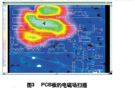 利用電磁輻射掃描儀,對裝聯并上電后的機盤掃描,得到PCB中電磁場分布圖(如圖3,圖中紅色、綠色、青白色區(qū)域表示電磁輻射能量由低到高),根據測試結果改進PCB設計。