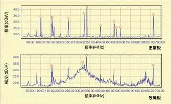 圖5為正常板和故障板的頻譜圖,通過(guò)對(duì)比,很容易發(fā)現(xiàn)故障板上存在一個(gè)異常的寬帶干擾。
