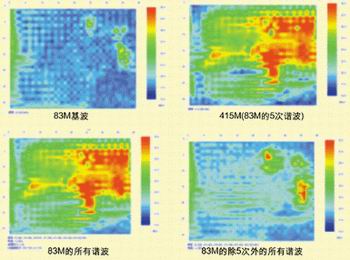 圖3的各個(gè)空間分布圖,是通過(guò)指定頻率點(diǎn)來(lái)看該頻率點(diǎn)的空間腹部圖。通過(guò)在圖中最上面的頻譜圖中用×指定頻率點(diǎn)后得到的??梢灾付ㄒ粋€(gè)頻率點(diǎn)查看每個(gè)頻率點(diǎn)的空間分布,也可以指定多個(gè)頻率點(diǎn),例如指定83M的所有諧波點(diǎn),查看總的頻譜圖。