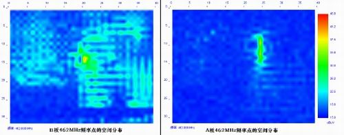 從空間圖中可以看出A板的總的電磁干擾分布區(qū)域比B板的小得多。再來(lái)看看某一個(gè)頻率點(diǎn)的電磁干擾分布情況。從圖8所示的462MHz這一個(gè)頻率點(diǎn)的電磁干擾分布情況來(lái)看,A板的幅度小,而且區(qū)域很小。B板的幅度大,而且分布區(qū)域特別廣。
