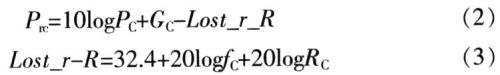 設(shè)發(fā)射系統(tǒng)的發(fā)射功率為Pc,單位為W;發(fā)射天線增益為Gc,單位為dB;發(fā)射距離為Rc,單位為km;信號傳輸損耗為Lost_r_R,單位為dB;信號頻率為fc,單位為MHz。發(fā)射信號到達接收系統(tǒng)的功率為: